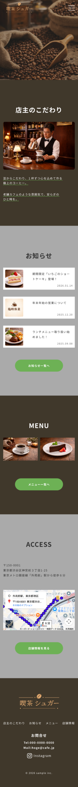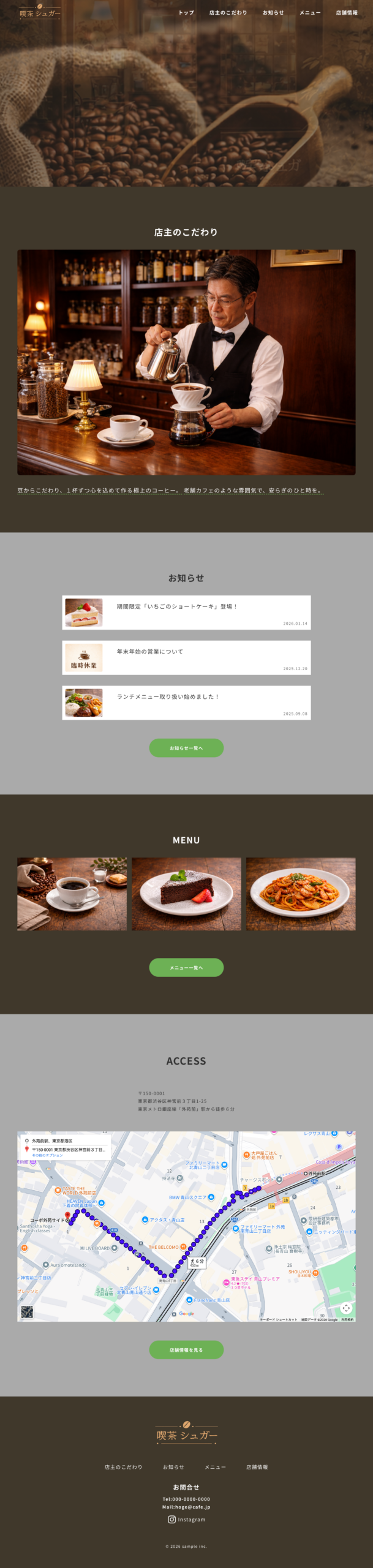 架空のカフェサイトを作成しました。レトロモダンなカフェをテーマに、暗めの茶色をメインカラーに使い、落ち着いた雰囲気を演出。シンプルな動線の中で、得たい情報をすぐに得られる設計にしました。さらに画像のスライドショーやボタンにアニメーションやレスポンシブを加えることでモダンなサイトに仕上げました。